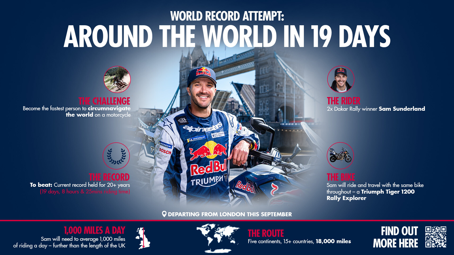 El viaje de Sam debe ser continuo y seguir una única dirección alrededor del globo. Debe empezar y terminar en el mismo lugar, tocar dos puntos antípodas y recorrer un mínimo de 29 000 kilómetros (18 000 millas). Todo esto debe hacerlo en la misma moto: una Triumph 1200 Rally Explorer.